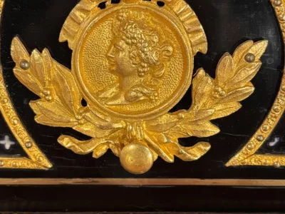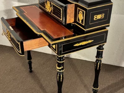 Klein "bonheur du jour" bureau in zwarte lak met vergulde bronzen en parelmoer decoratie, gesigneerd P. Sormani (1817-1877). Rood lederen schrijfoppervlak.