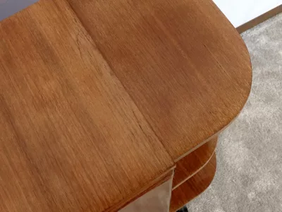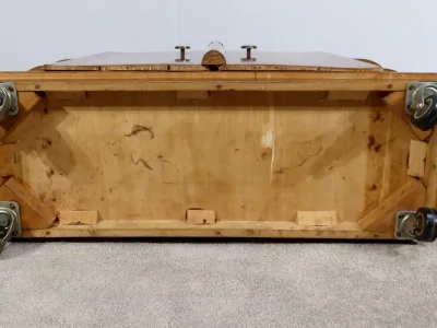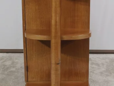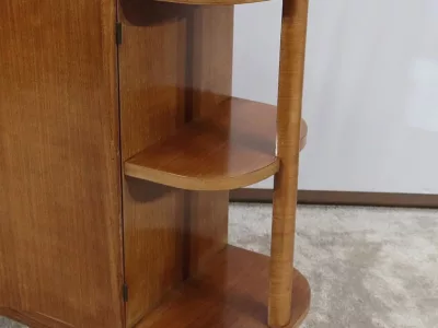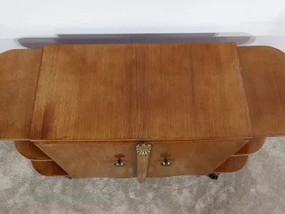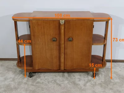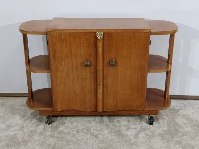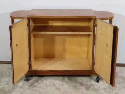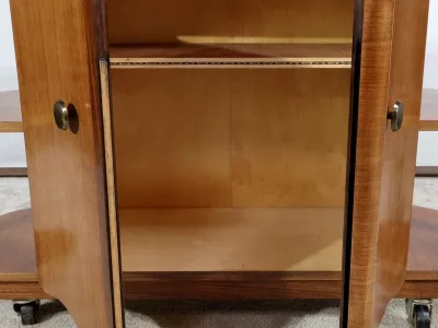 Шкаф для напитков в стиле ар-деко на колесиках, облицованный ореховым шпоном, с внутренней частью из платана. Восстановлен в нашей мастерской и в идеальном состоянии. Свяжитесь с нами для доставки <. Артикул: 020523.4