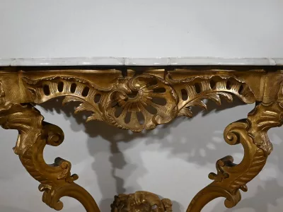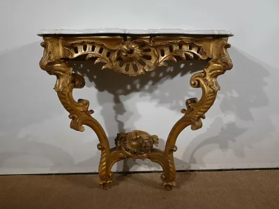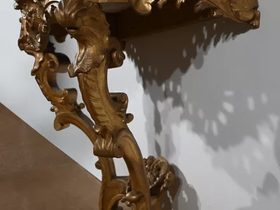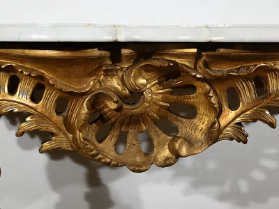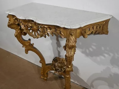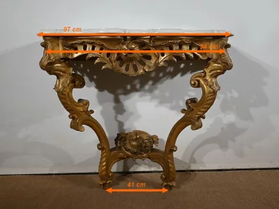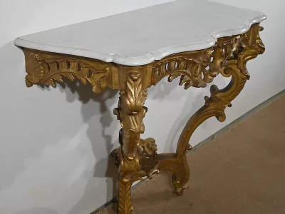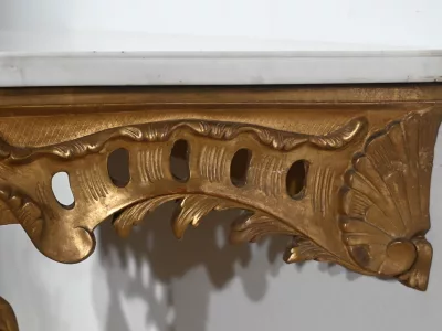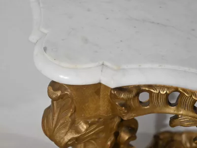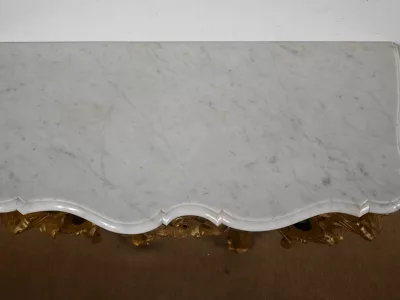 Пристенный консольный стол середины девятнадцатого века из позолоченного дерева со столешницей из белого мрамора. Отличные условия. Свяжитесь с нами для доставки. Ссылка: 071222