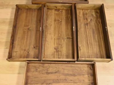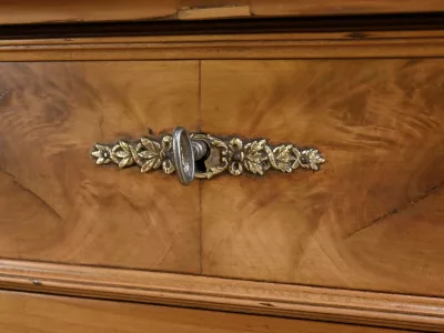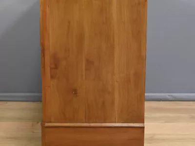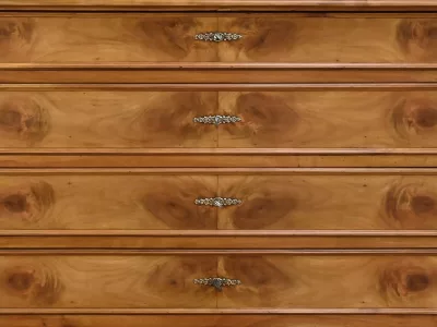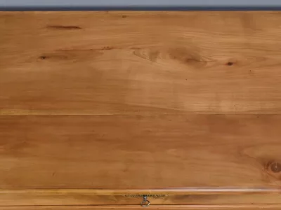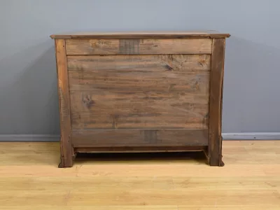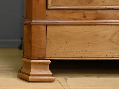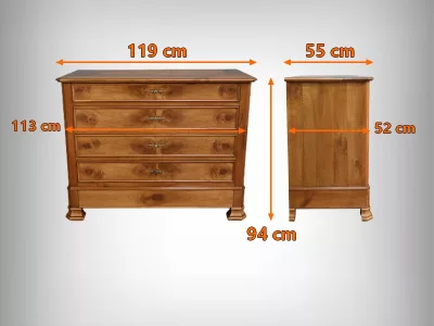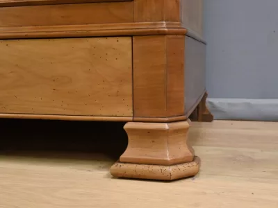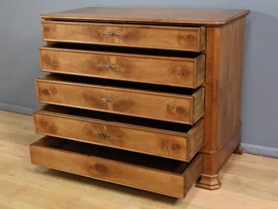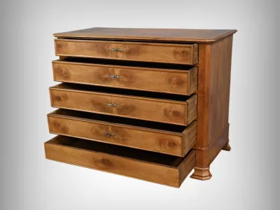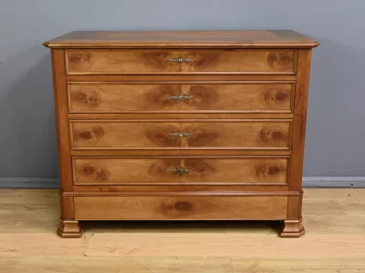 Комод в стиле Луи-Филиппа из вишнёвого дерева, около 1900 года. Пять ящиков, один из которых скрыт в цоколе, четыре с замками и ключами. Замочные скважины из штампованной латуни. Отреставрирован в нашей мастерской, в отличном состоянии. Покрыт воском. Свяжитесь с нами для доставки. Артикул: 161025