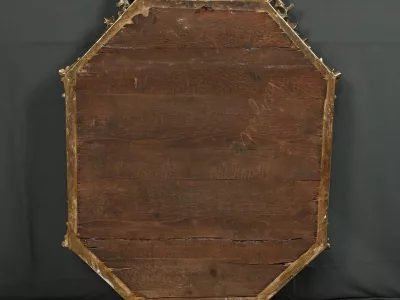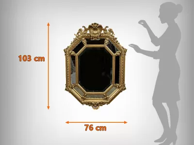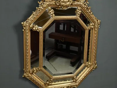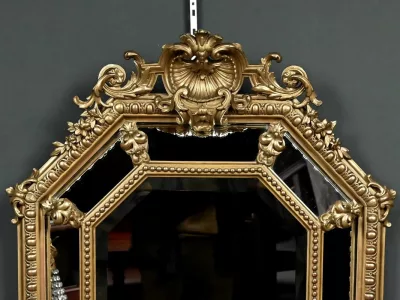 Восьмиугольное зеркало-купе середины XIX века. Зеркало со скошенными краями в богато декорированной раме из позолоченного дерева и лепнины. Очень хорошее состояние. Реставрация. Свяжитесь с нами для организации доставки. Артикул: 412 V
