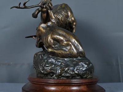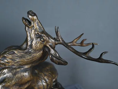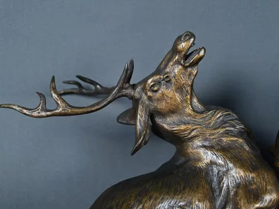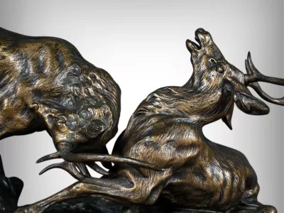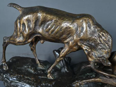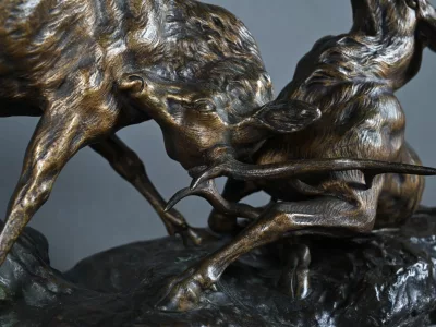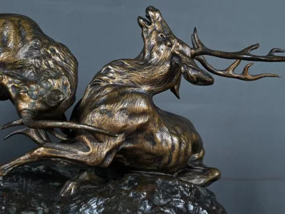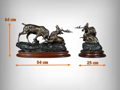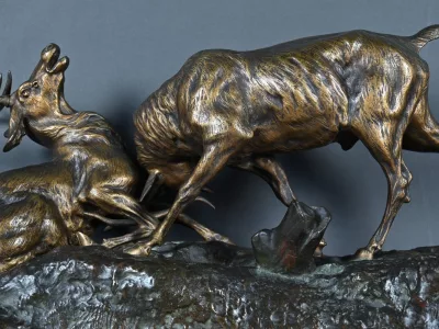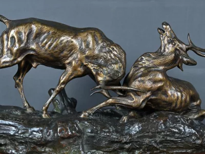 Бронзовая скульптурная группа с изображением сражающихся оленей, подписанная T. Cartier (Томас Франсуа Картье, 1879-1943). Очень хорошее состояние. Свяжитесь с нами для уточнения условий доставки. Артикул: 441 V