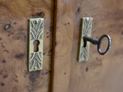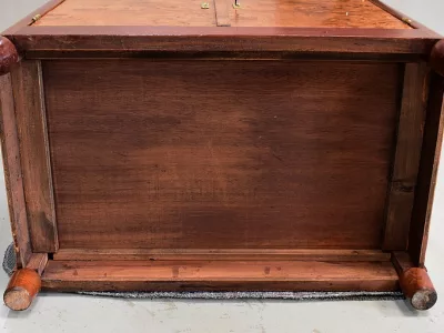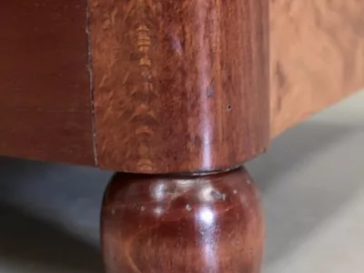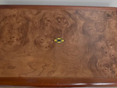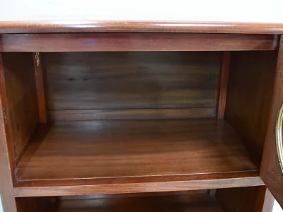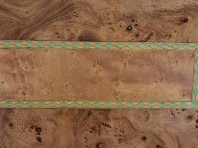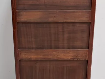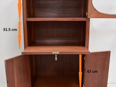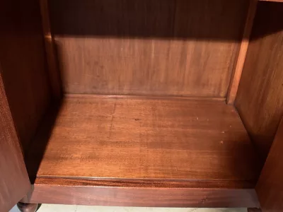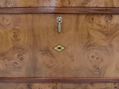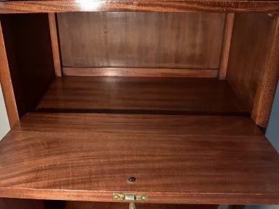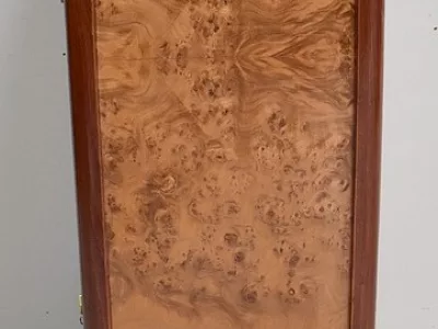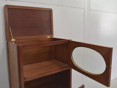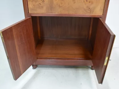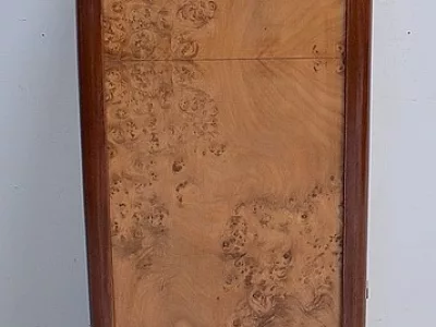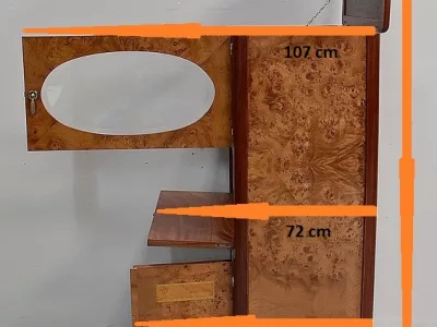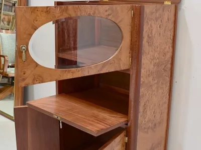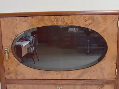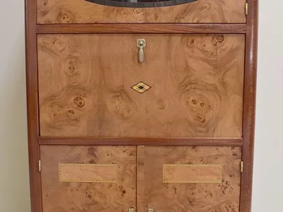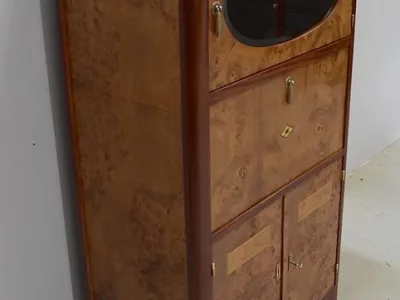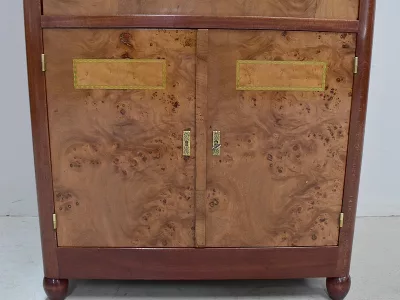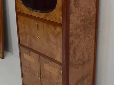 Шкаф в стиле ар-деко из шпона телячьего дерева на структуре из бука и красного дерева. Шкаф состоит из трех частей: - верхняя часть с овальным фронтальным стеклом и подъемным верхом - центральная часть с откидной створкой - нижний двухдверный шкаф Восстановлен в нашей мастерской и в идеальном состоянии. Ссылка: 457 R
