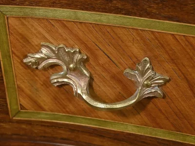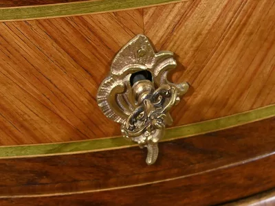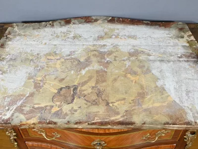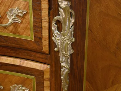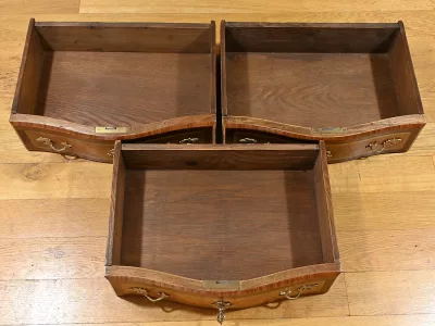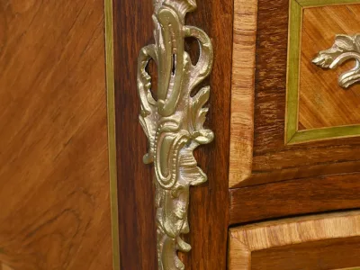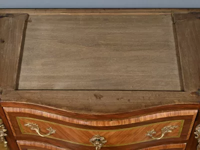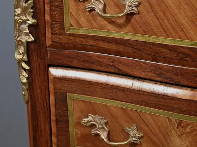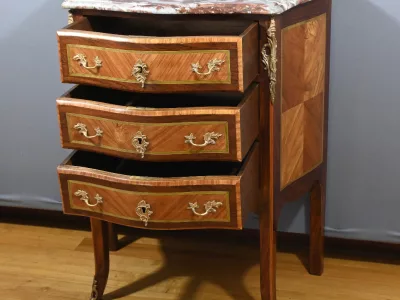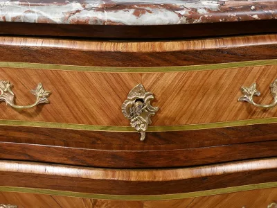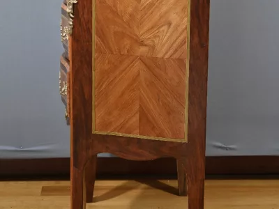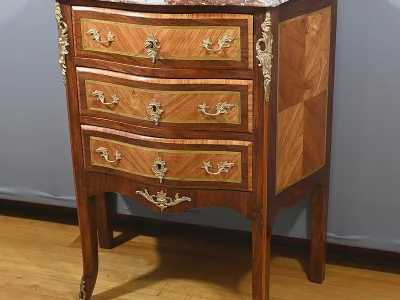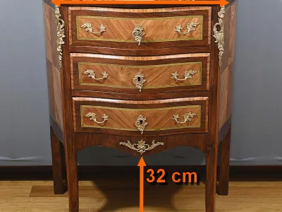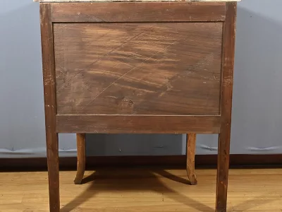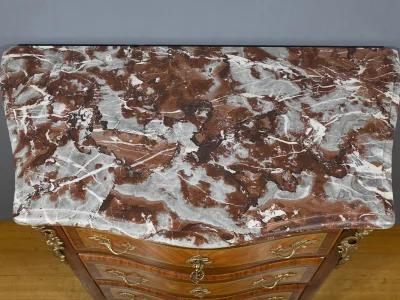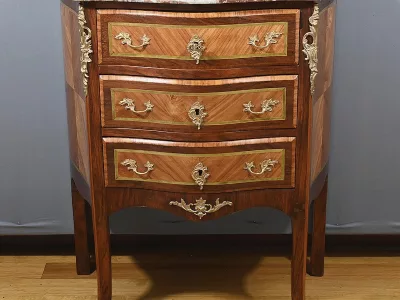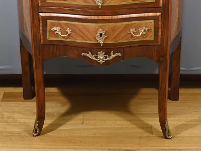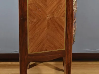 Комод в переходном стиле с инкрустацией из розового дерева с атласным деревом и инкрустацией из мореного дерева. Три выдвижных ящика с дугообразными передними ручками и замочными скважинами. Бронзовая отделка и мраморная столешница. Начало двадцатого века. Отреставрирован в нашей мастерской и в отличном состоянии. Восковая отделка на твердой поверхности. Свяжитесь с нами для доставки. Артикул: 607 P Bis