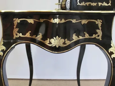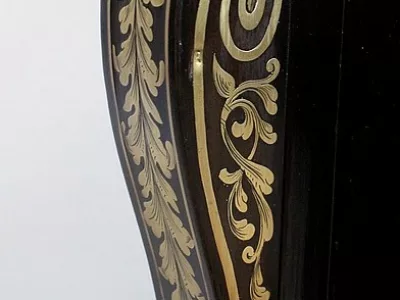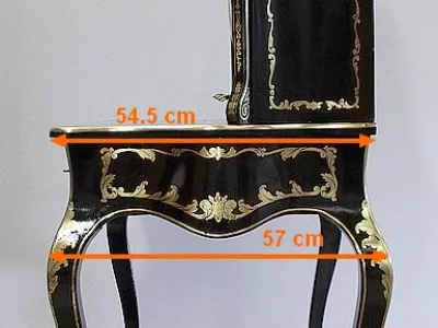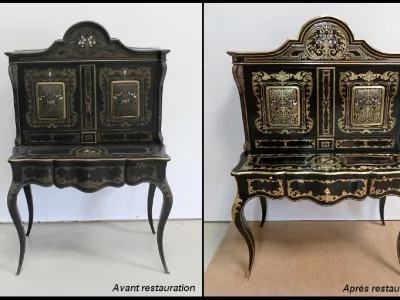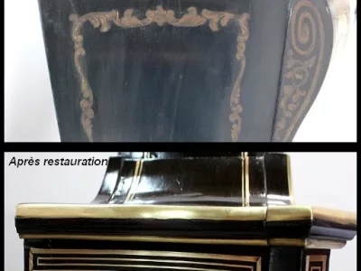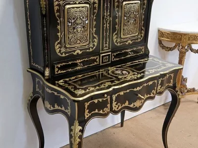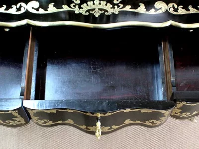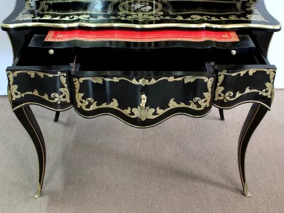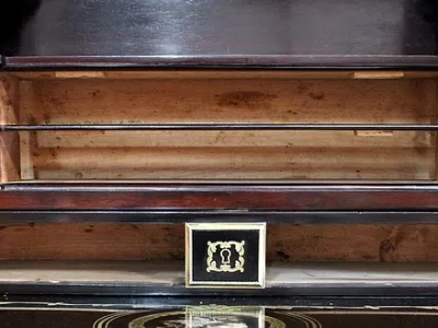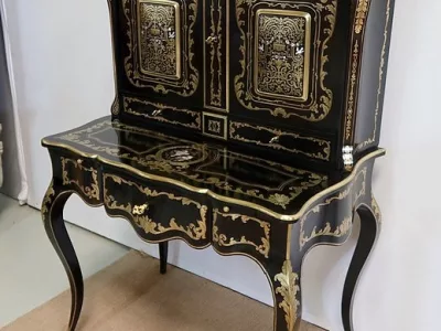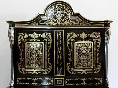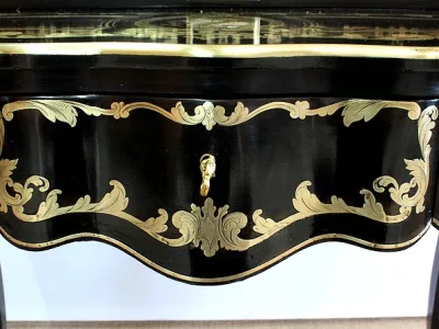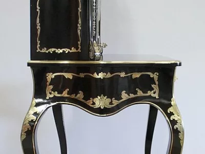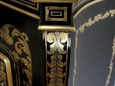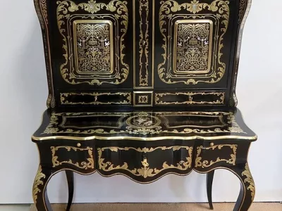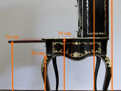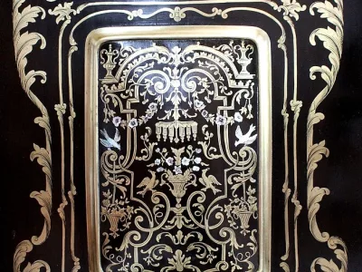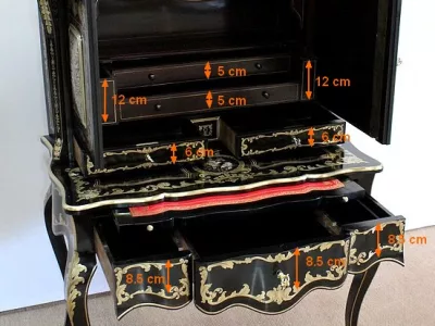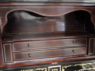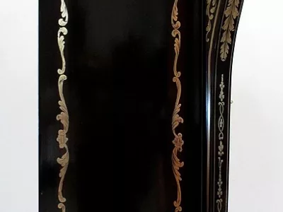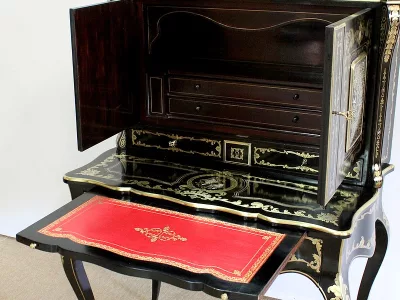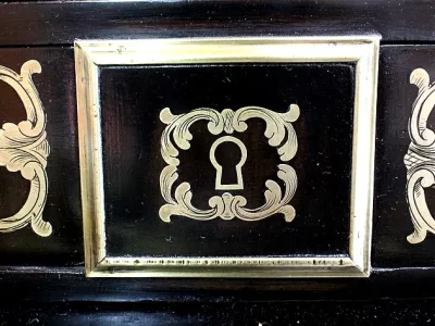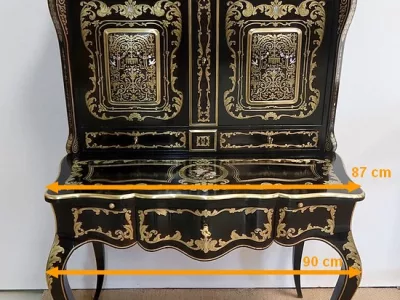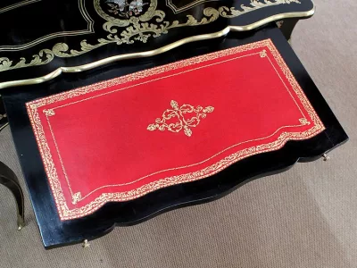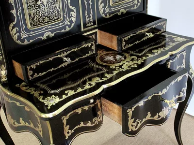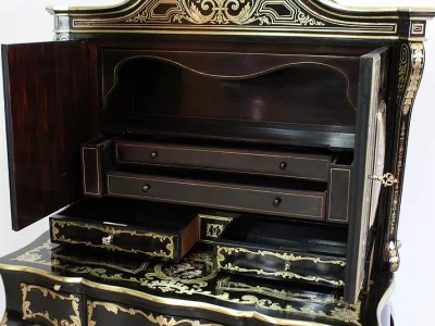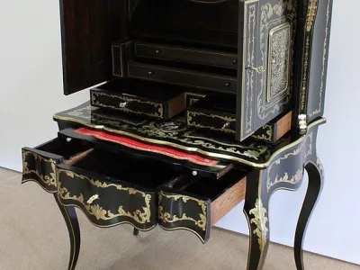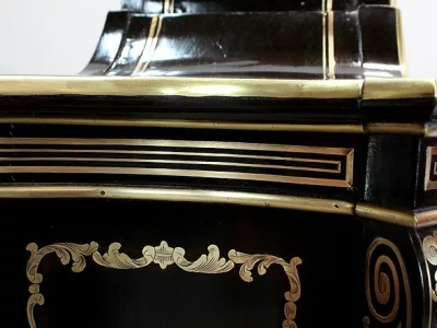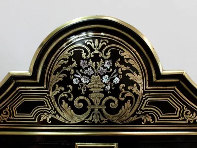 Шкаф эпохи Наполеона III из черного дерева с богатой латунной отделкой и украшением в виде птиц из перламутра. Выдвижная поверхность для письма из красной кожи. Восстановлен в нашей мастерской и в идеальном состоянии с французской полировкой. Артикул: 830 S