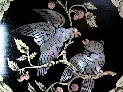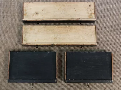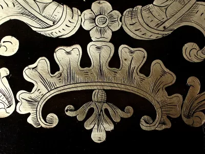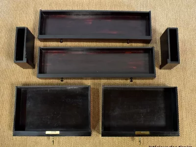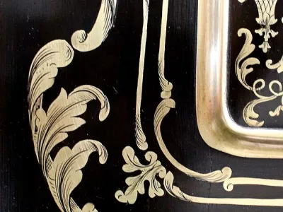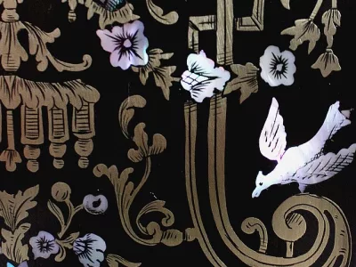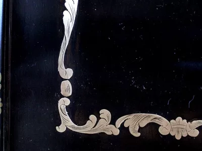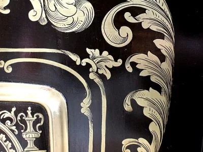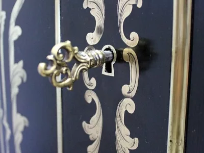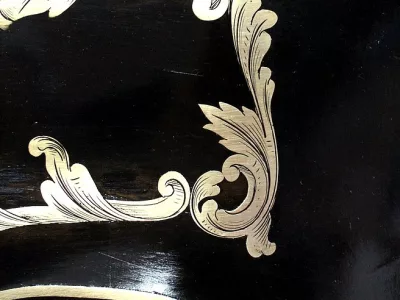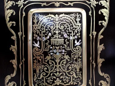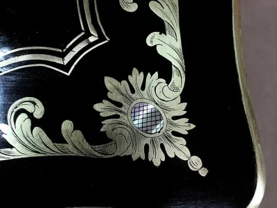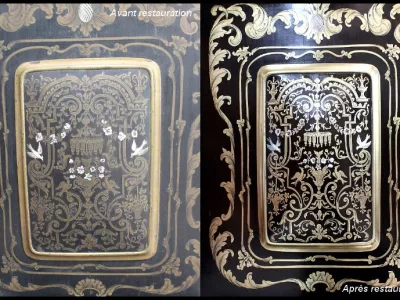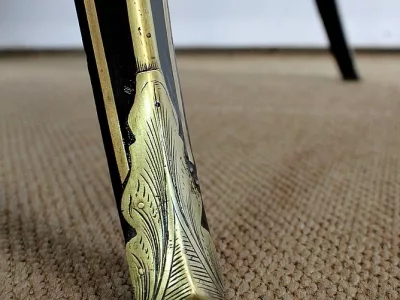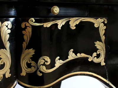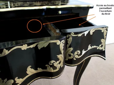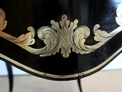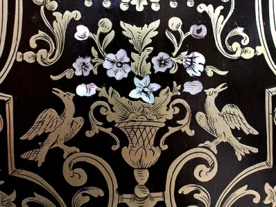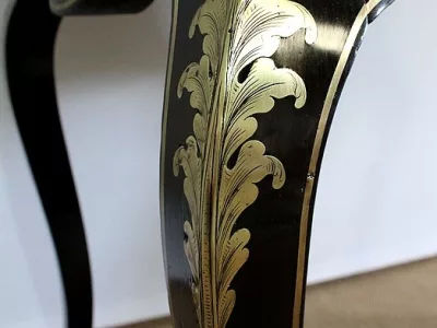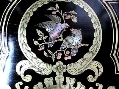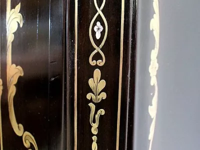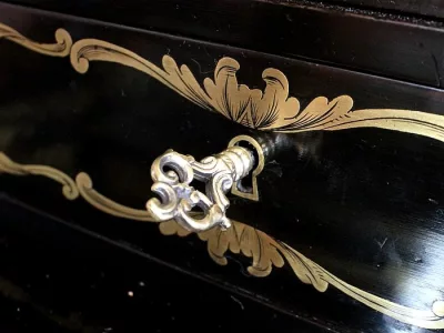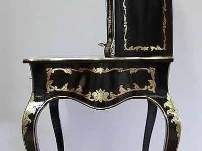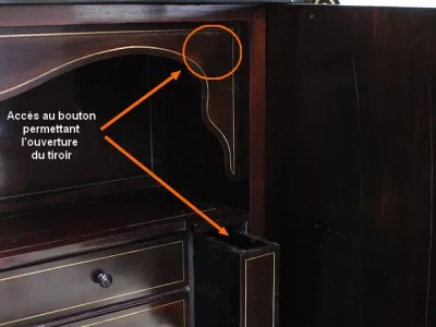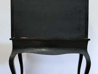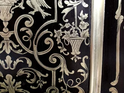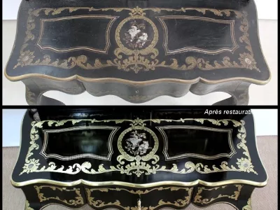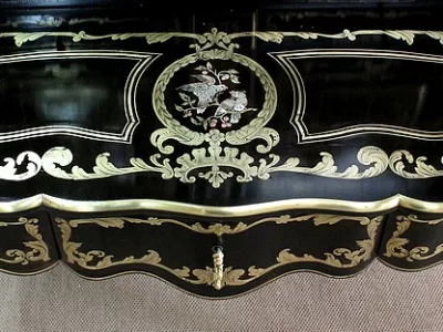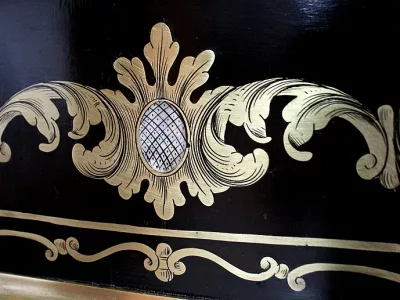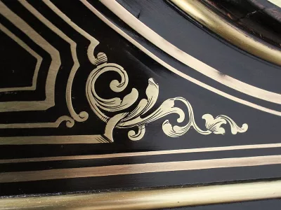 Шкаф эпохи Наполеона III из черного дерева с богатой латунной отделкой и украшением в виде птиц из перламутра. Выдвижная поверхность для письма из красной кожи. Восстановлен в нашей мастерской и в идеальном состоянии с французской полировкой. Артикул: 830 S