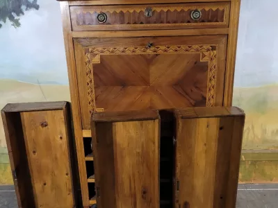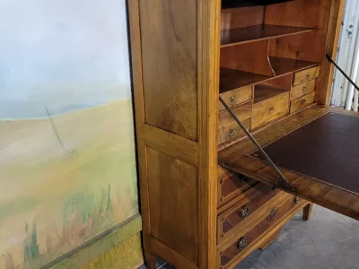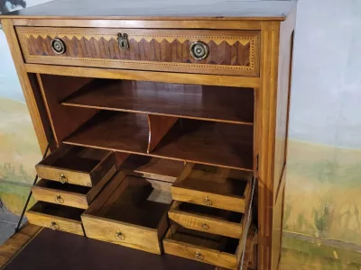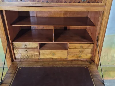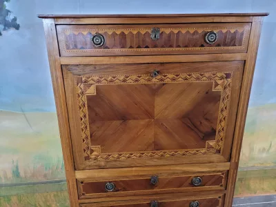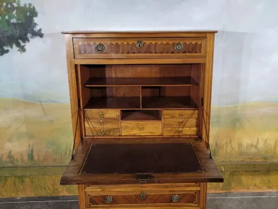 Великолепный секретер эпохи Людовика XVI из ореха с инкрустацией из атласного дерева, черного дерева и ясеня. Откидная створка, открывающая кожаную поверхность для письма. Бронзовые ручки. Отделка пчелиным воском. Бесплатная доставка по материковой части Франции.