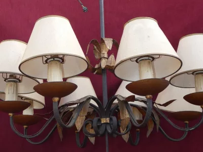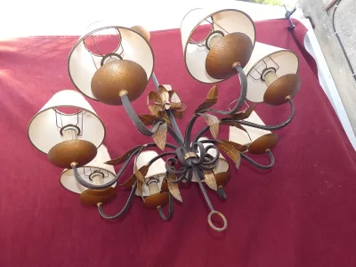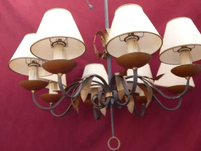 Большой светильник из кованого железа и позолоченной латуни в стиле Ройер. В хорошем состоянии, включая проводку. Абажуры требуют внимания.