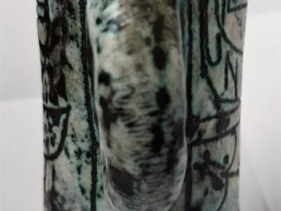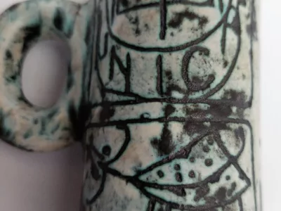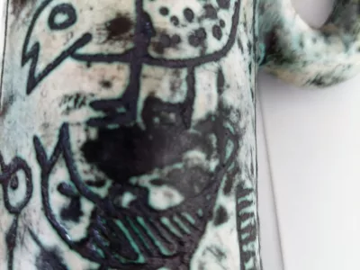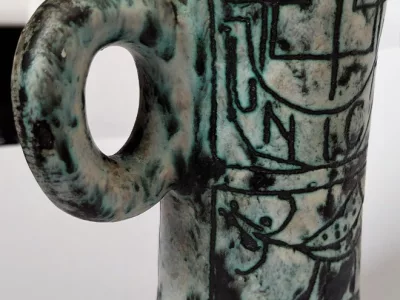 Jacques Blin(约 1950 年代)的陶瓷壶瓶,绿色背景上有 Shadok 装饰。