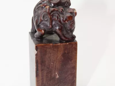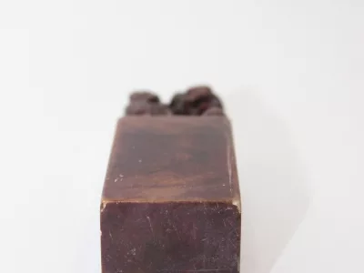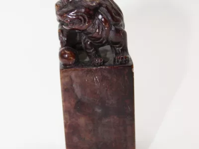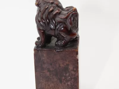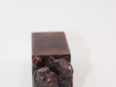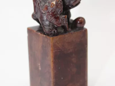 中国印章,图案为两只狗和一个球,方形底座,棕色石头,约 1900 年,状况良好。