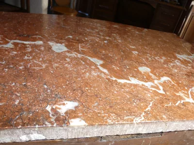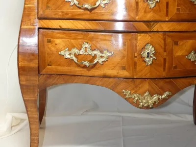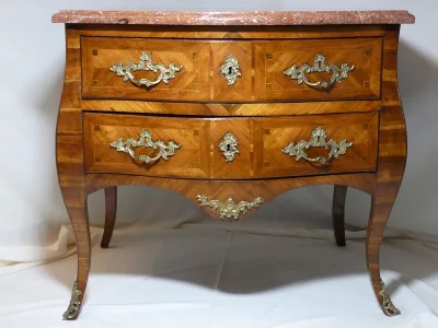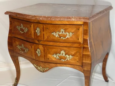 非常有吸引力的十八世纪那不勒斯“sauteuse”抽屉柜,采用镶嵌细工,配有红色大理石顶部。早期修复。