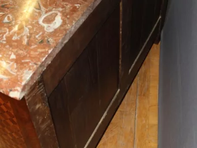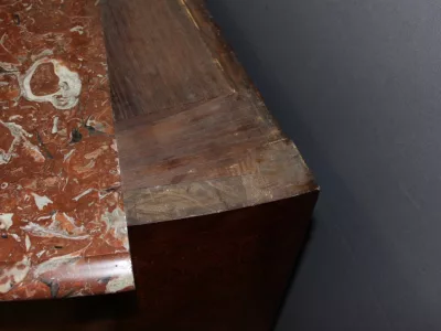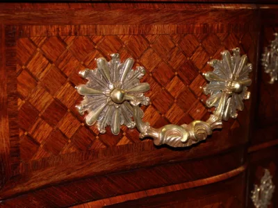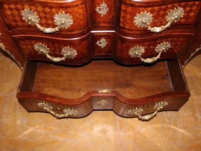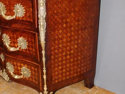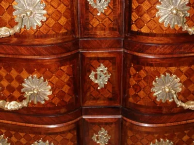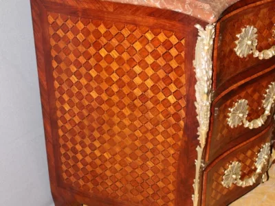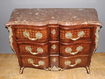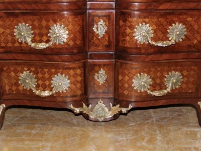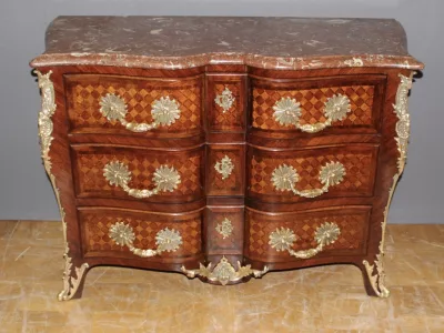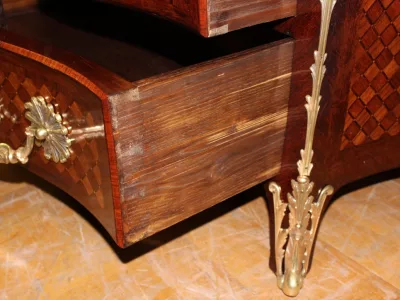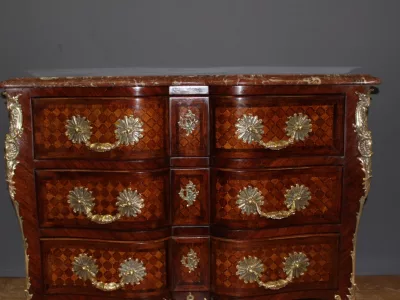 路易十四风格的镶嵌物“ arbalete”抽屉柜,约1900年。丰富的青铜色装饰,大理石台面,状况极佳。