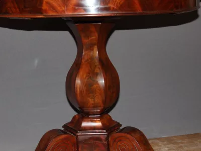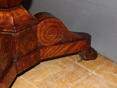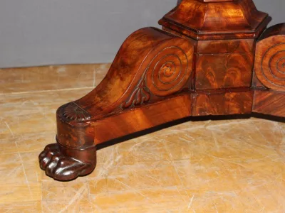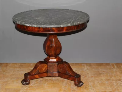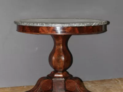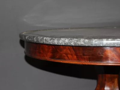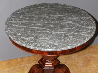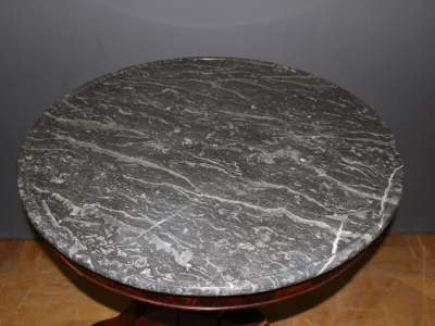 恢复期桃花心木底座桌,灰色大理石台面。良好的条件。