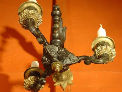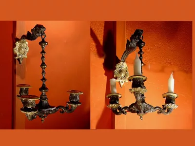 19世纪初(上半年)3支青铜烛台,青铜古铜色和黑色古铜,挂着一只手臂。没有电气化。细节