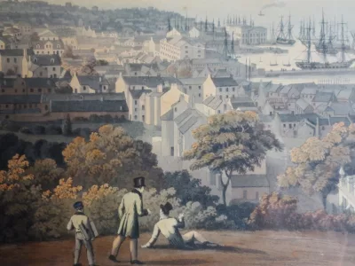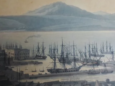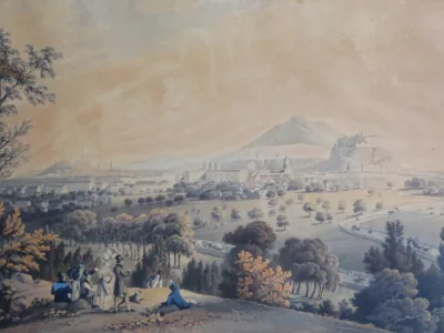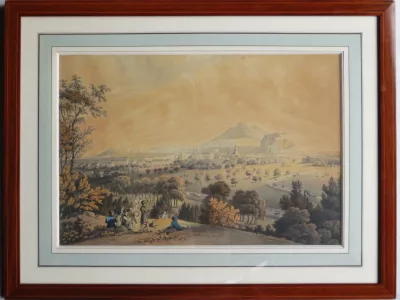 John Heaviside Clark (1770-1863) 用水彩突出显示的两幅版画,一幅是爱丁堡的,另一幅是格里诺克的。它们是 1820 年至 1830 年间印制的十八幅苏格兰景观的一部分。总体状况良好,但有轻微斑点。最近的帧。框架:57.5 厘米 x 75 厘米,视图:36.5 厘米 x 54 厘米。