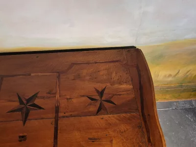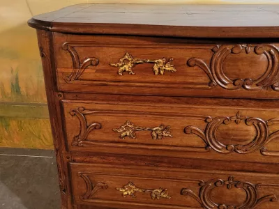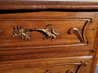 路易十五时期的五斗柜,采用精雕细琢的胡桃木制成,产自法国东部。镀金青铜抽屉把手。顶部和侧面有几何镶嵌。法国境内免费送货。