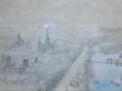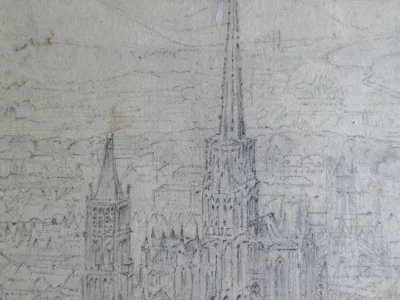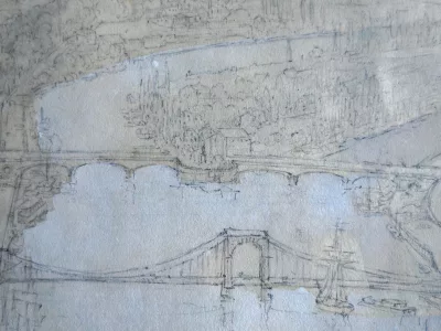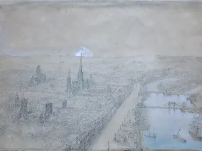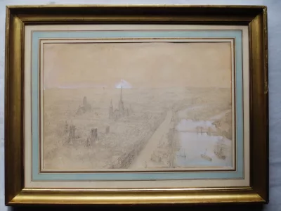 十九世纪大型素描,描绘鲁昂和塞纳河。镀金木画框:50 厘米 x 65 厘米,视野:33 厘米 x 48 厘米。