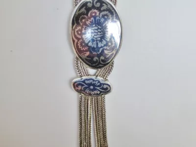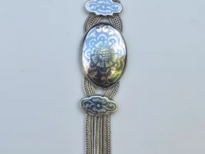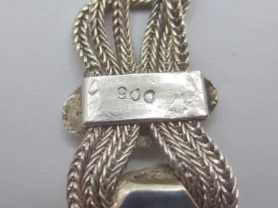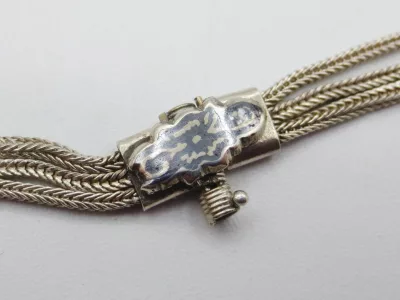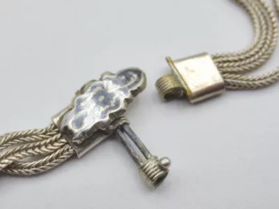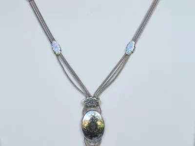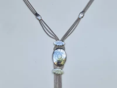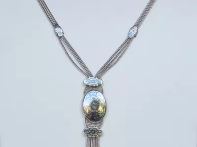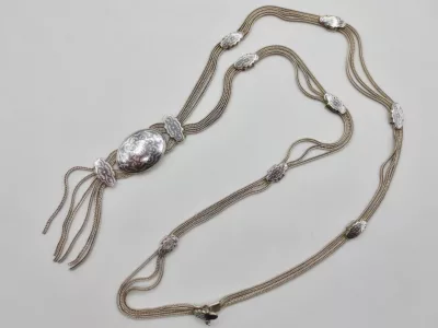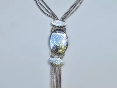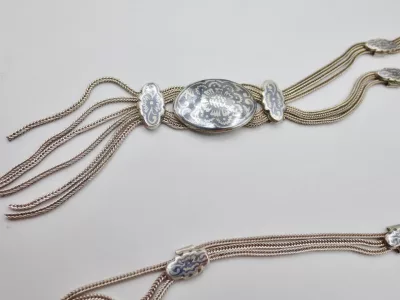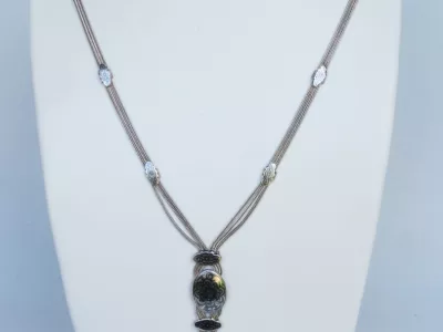 银项链,由三条链组成,末端为镶嵌黑金银吊坠。每条链子上均有土耳其900纯度标记。二十世纪作品。项链总长65厘米,吊坠长9厘米。