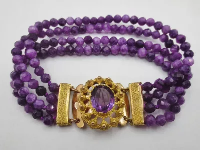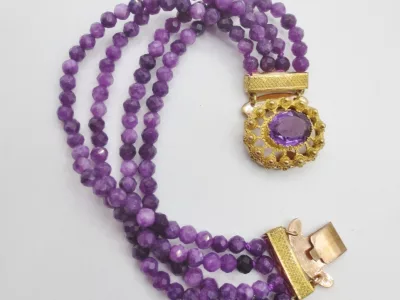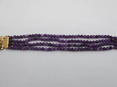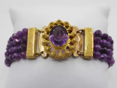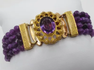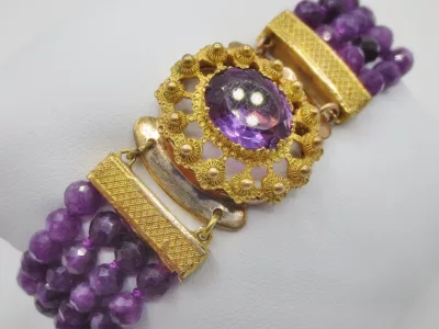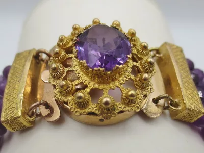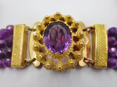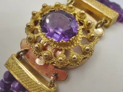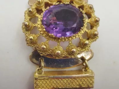 这款复原时期的手镯镶嵌四排紫水晶,中央为仿紫水晶(需注意略带灰色)。镀金搭扣为1820-1830年间的典型款式。四排紫水晶曾于早期重新组装。腕围:18.5厘米。