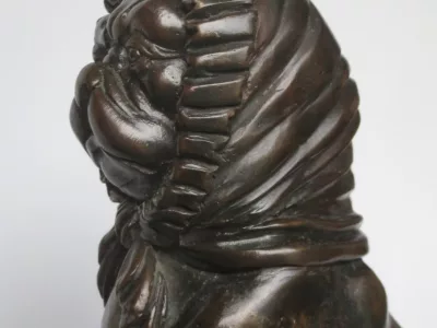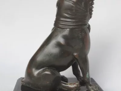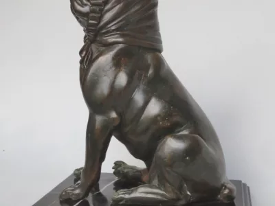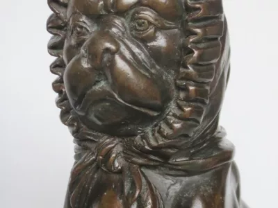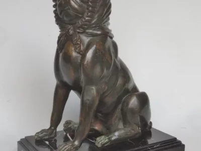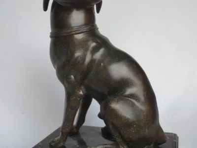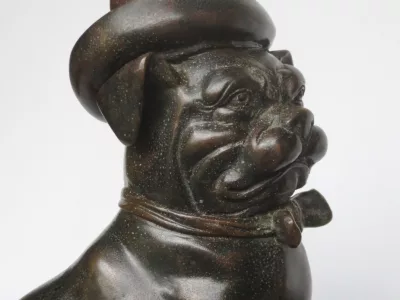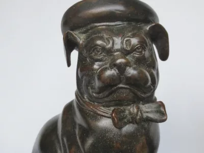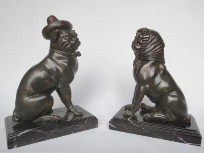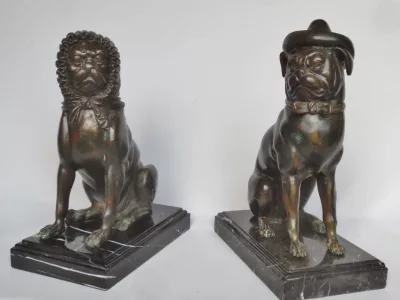 一对青铜哈巴狗,雄性戴帽子和领结,雌性戴软帽。黑色大理石底座。二十世纪。雄性含底座高38厘米,雌性高35厘米。