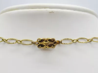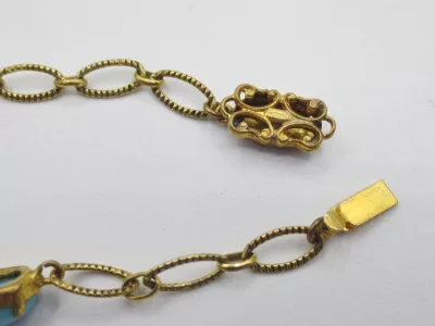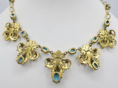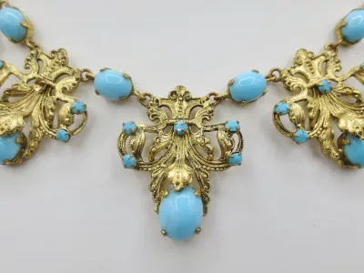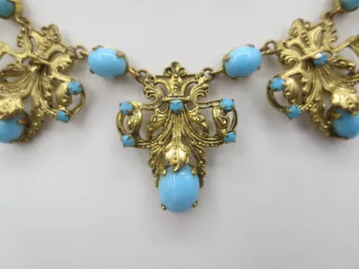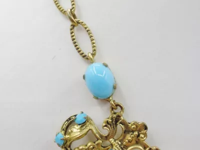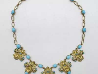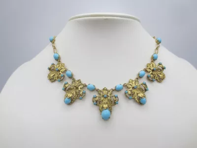 镀金金属“垂饰”项链,配绿松石珠。品相完美。二十世纪。长度:42厘米。