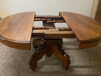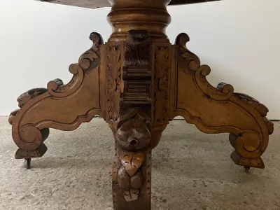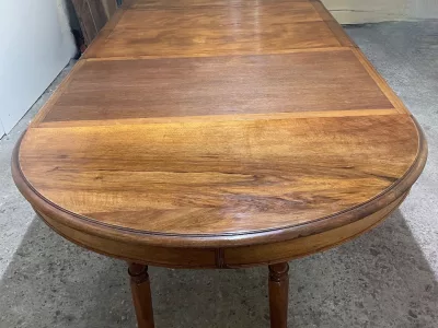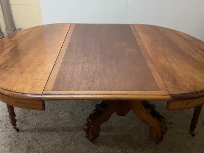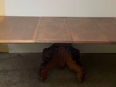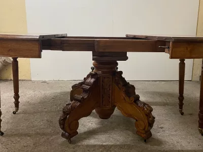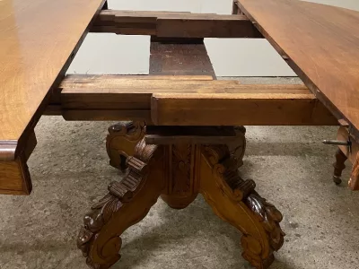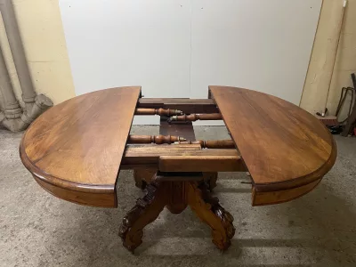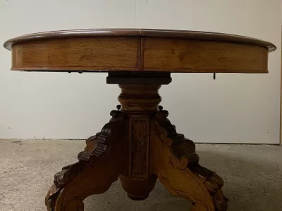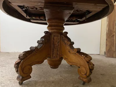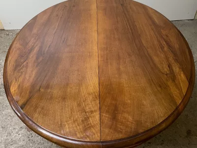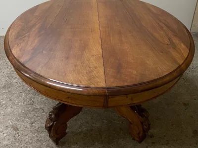 胡桃木圆形底座桌,中间开口,可容纳四片延伸的叶子。四个折叠腿支撑着叶子。座位 14。完全打开:305 厘米。