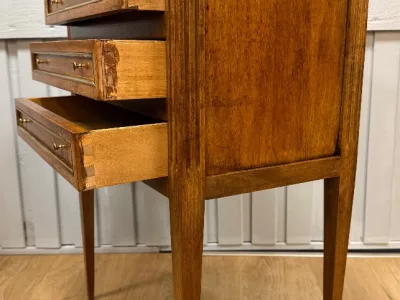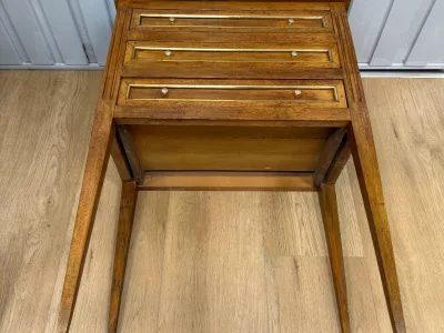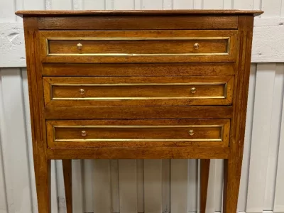 路易十五风格的胡桃木三抽屉梳妆台,每个抽屉都镶嵌有黄铜。