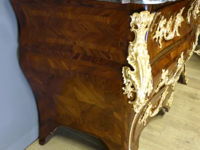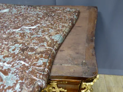 Cómoda de terciopelo "tombeau" de estilo Luis XVI en marquetería con tapa de mármol y decoración en bronce dorado.