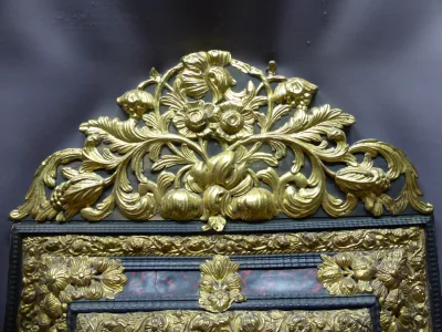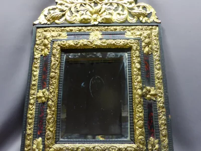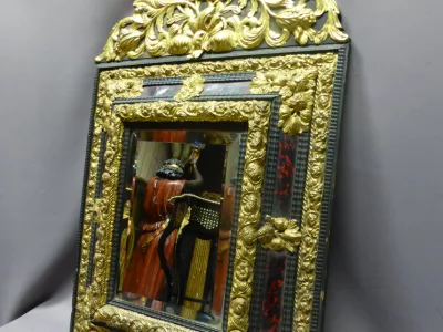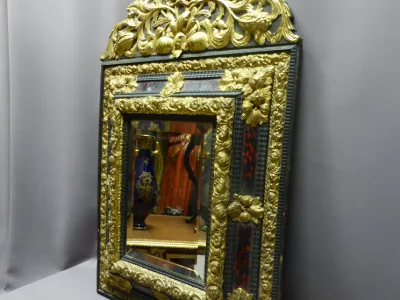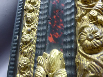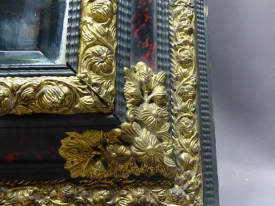 Espejo estilo Luis XIII del siglo XIX en madera negra, latón repujado y caparazón de tortuga. Napoleón III peeriod.