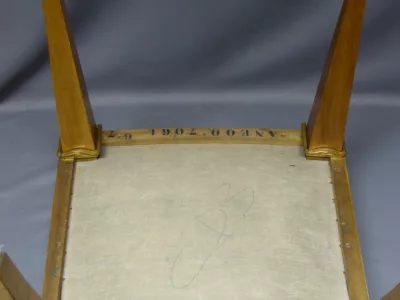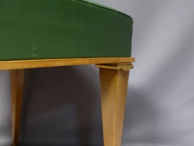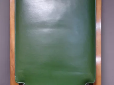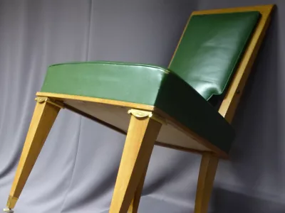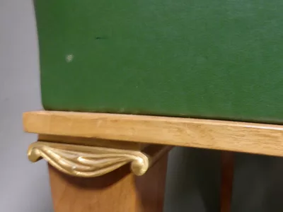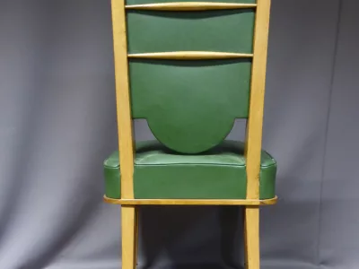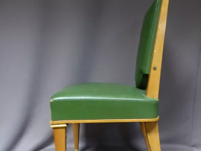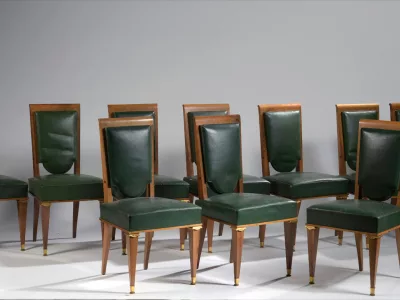 Suite de 12 sillas de época art déco en madera frutal con decoración en bronce dorado y sus respaldos y asientos de cuero verde original. Patas delanteras ajustables (ver foto). En el estilo de Maurice Jallot '1900-1971).