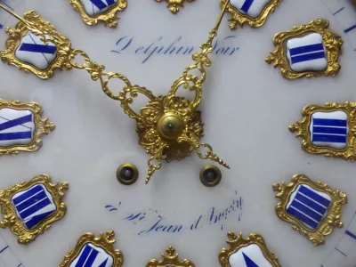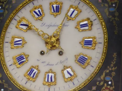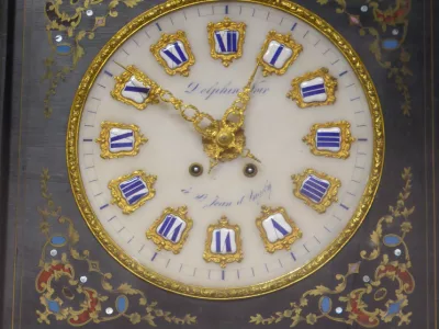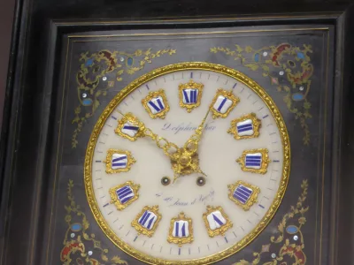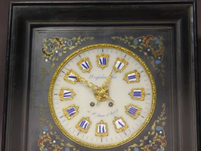 Muy atractivo reloj "oeil de boeuf" del período Napoleón III en madera negra y marquetería de caparazón de tortuga de color.