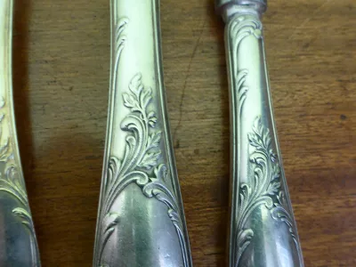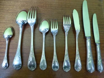 Caja de cubiertos de roble que contiene 123 piezas de cubiertos Christofle en placa de plata, modelo Marly: - 12 tenedores grandes - 12 cucharas grandes - 12 cuchillos grandes - 12 cucharas - 12 tenedores de postre - 12 cuchillos de postre - 12 tenedores de pescado - 12 cuchillos de pescado - 1 cucharón - 11 cucharas de postre - 1 cuchara grande para servir - 1 tenedor grande para servir - 1 cuchillo de trinchar - 1 rebanada de pastel - 11 piezas para servir Todas las piezas están firmadas Christofle. Tenemos más cubiertos Christofle disponibles para completar el servicio a pedido.