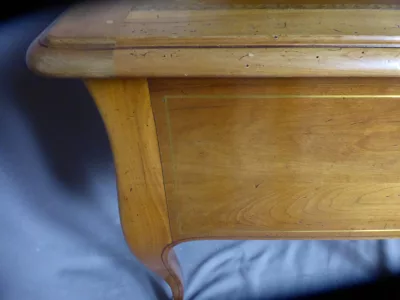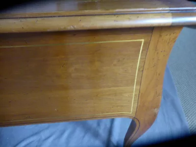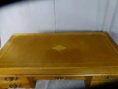 Escritorio de estilo Luis XV en madera de cerezo con tapa de cuero (un poco gastado). Incrustaciones de latón en los cajones. Cajones de imitación en el lado visitante. Contáctenos para la entrega.
