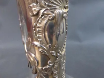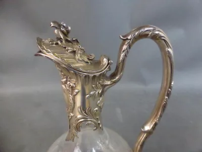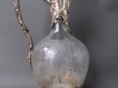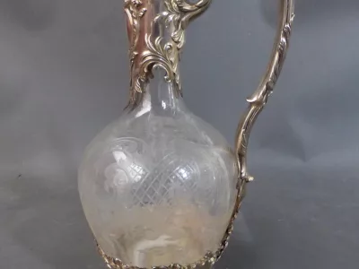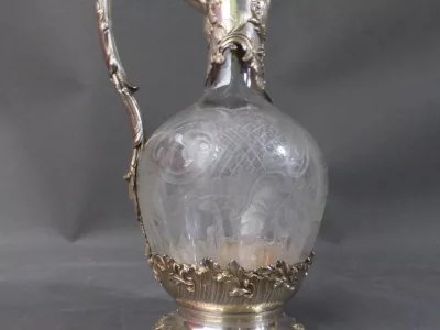 Jarra en plata y cristal grabado. Sello de Minerva. Contáctenos para la entrega.