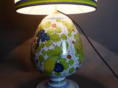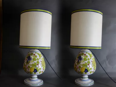 Par de grandes lámparas del siglo XX en loza con pantallas de Marie Sapet. Póngase en contacto con nosotros para la entrega.
