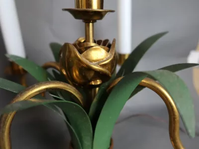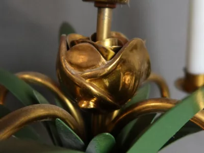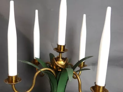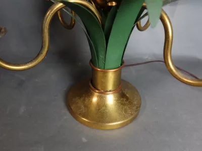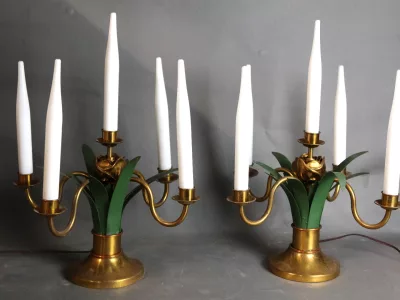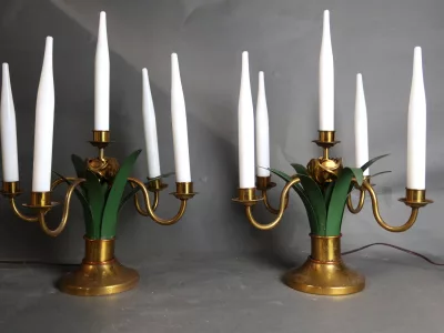 Pareja de lámparas de los años cincuenta en estaño pintado, latón dorado y opalina. Cableado original en condiciones de funcionamiento. Contáctenos para la entrega.