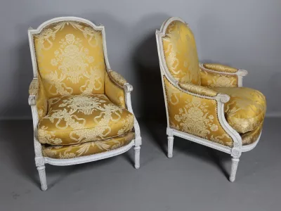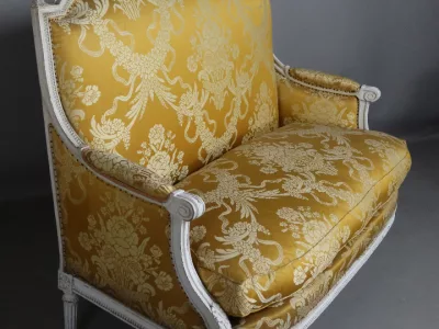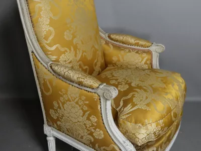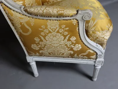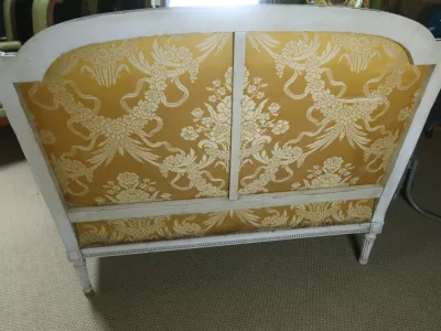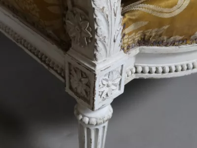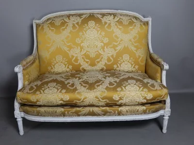 Suite de tres piezas estilo Luis XVI en madera tallada y pintada. Textil en buen estado excepto el respaldo del sofá que está roto y falta el trenzado que cubría los clavos. Contáctenos para la entrega.