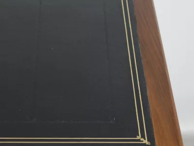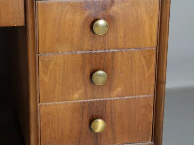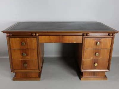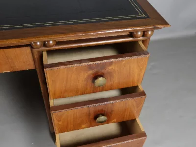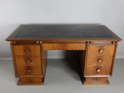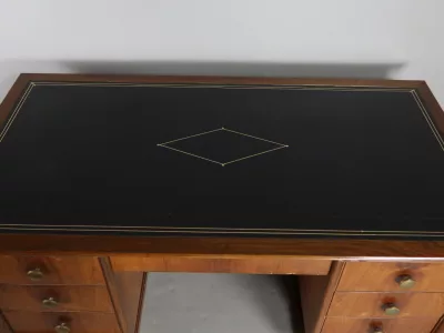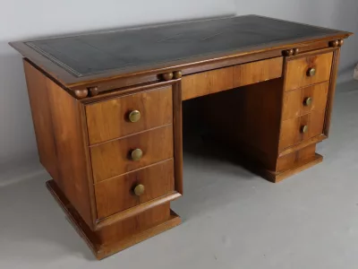 Escritorio con pedestal de época Art Déco en nogal con tapa de cuero nuevo. Doble cara. Librería a juego también disponible.