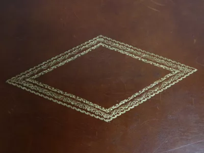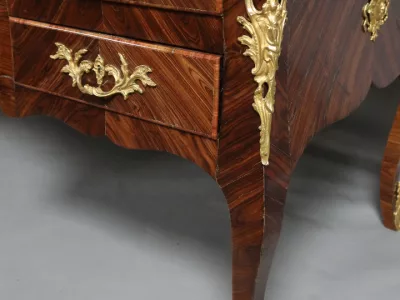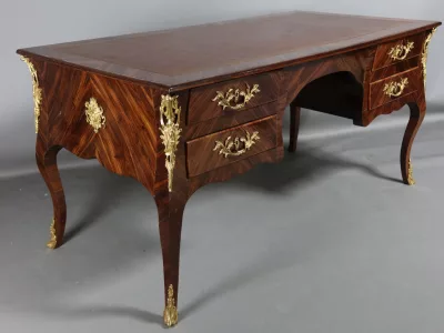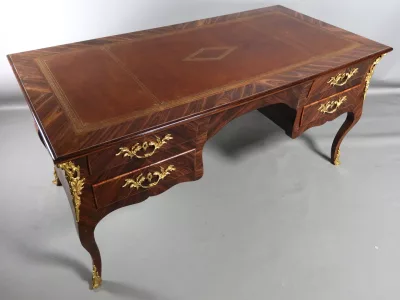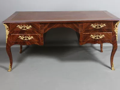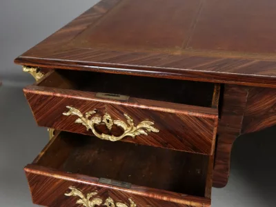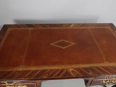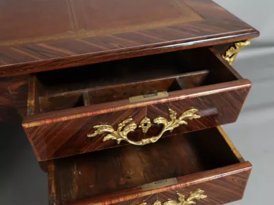 Gran escritorio de época Luis XV en kingwood con cuatro cajones en un lado y cajones idénticos de imitación en el lado de las visitas. Tapa de cuero y atractiva decoración en bronce dorado. Contáctenos para la entrega.