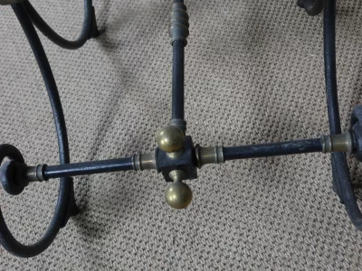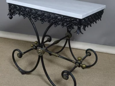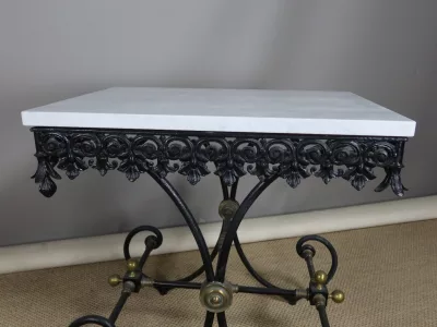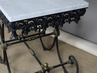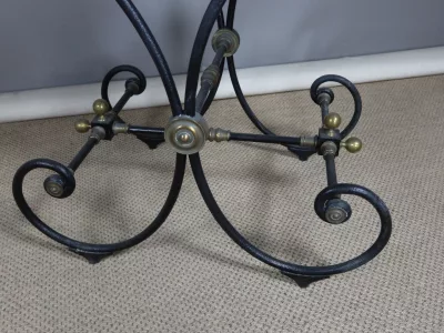Mesa de carnicero en hierro forjado, latón y hierro fundido. Principios del siglo XIX. Ligeramente dañado en el lateral (falta tulipán). Mármol en perfecto estado.