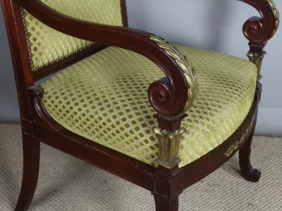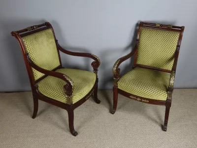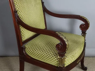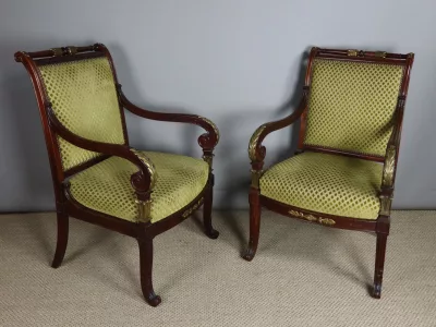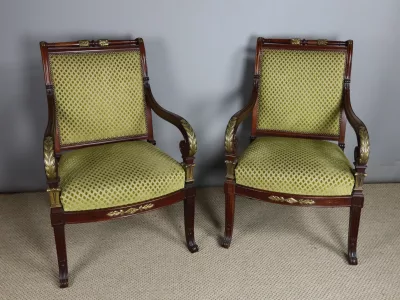 Pareja de sillones de época Napoleón III en caoba con decoración en bronce. Tejido y carpintería en buen estado. Altura del asiento: 43 cm. Altura total: 94 cm. Contáctenos para su entrega.
