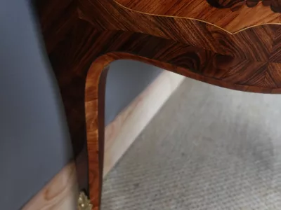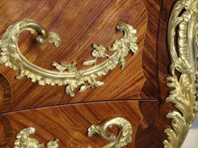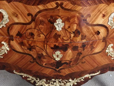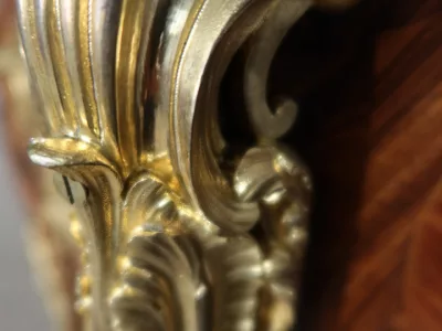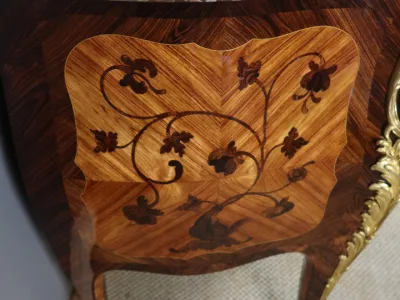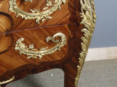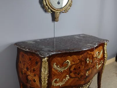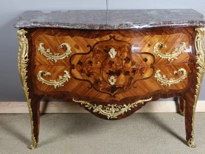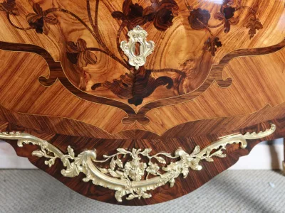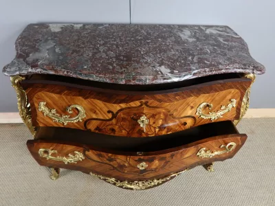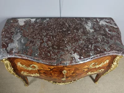 Cómoda "Sauteuse" en marquetería con sobre de mármol y excepcional decoración en bronce dorado. Doble firma "Perreau", ebanista mencionado en la página 485 del libro "La Quintessence du Meuble au XIXeme" de Christoher Payne. Totalmente restaurada en nuestro taller. Contáctenos para su entrega.