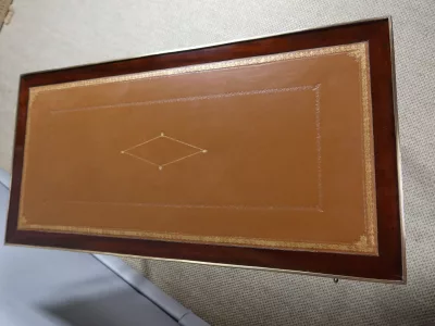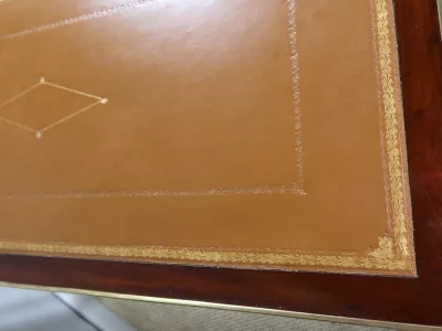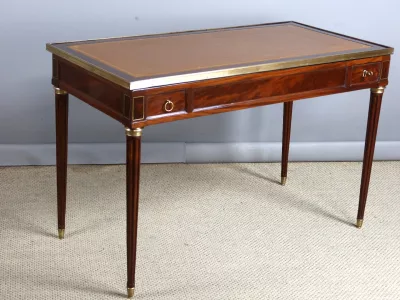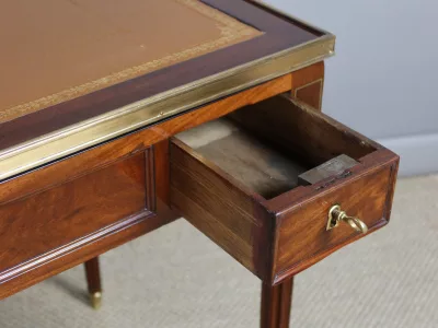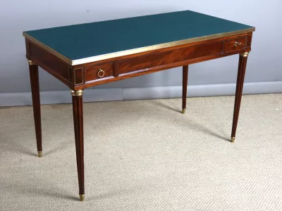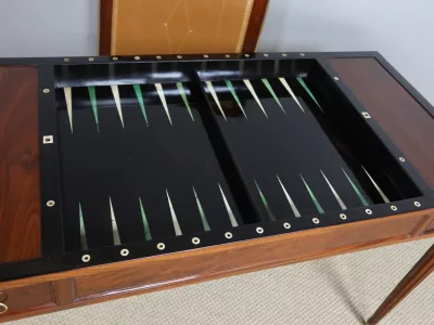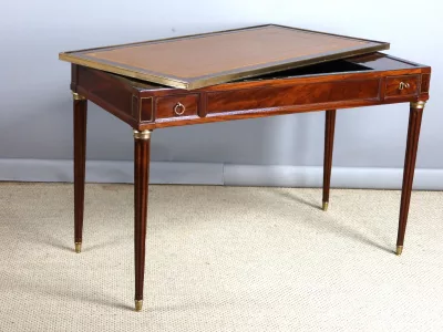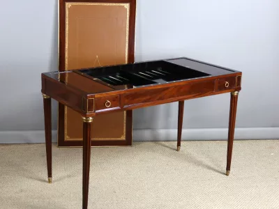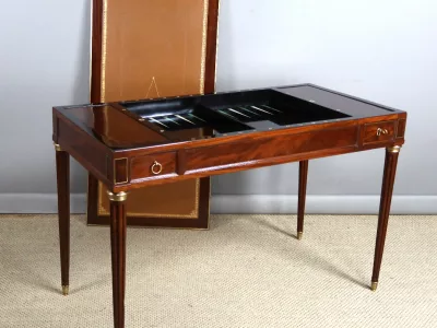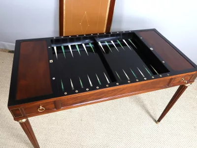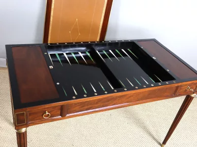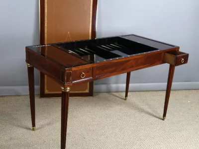 Mesa de caoba de finales del siglo XVIII con sistema Tri-Trac. Tablero reversible con cuero en un lado y fieltro verde en el otro. Pequeño cajón en cada lado. Totalmente restaurada y repulida a la francesa. Cuero nuevo. Contáctenos para la entrega.