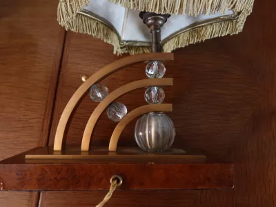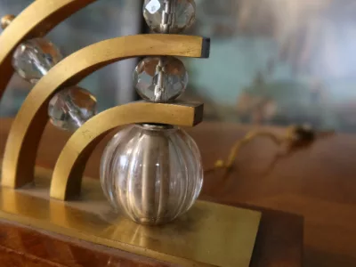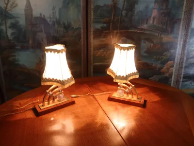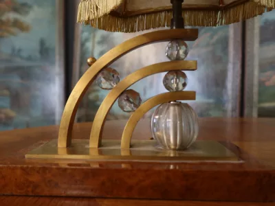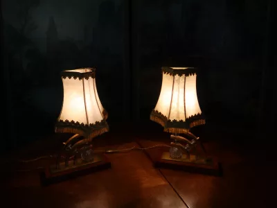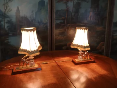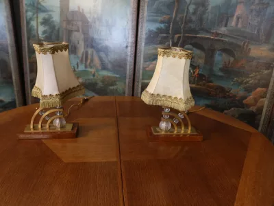 Pareja de lámparas vintage en madera, bronce dorado y cristal, con pantalla de pergamino. Hacia 1950-60. Contáctenos para entrega.