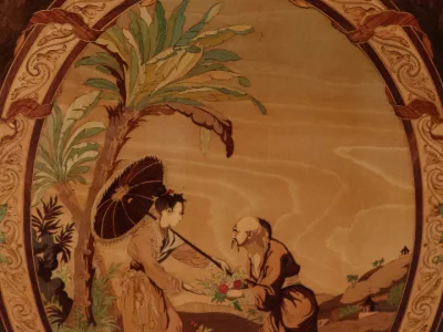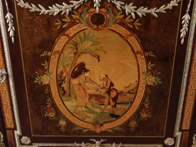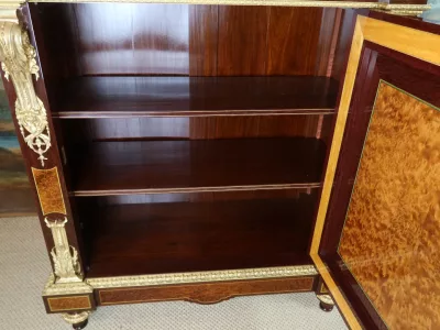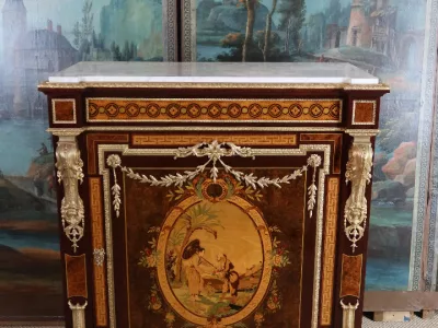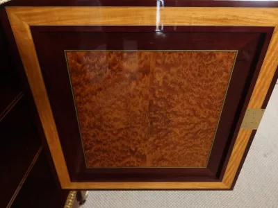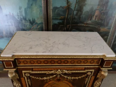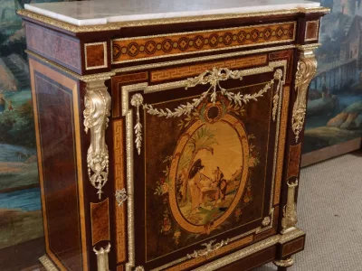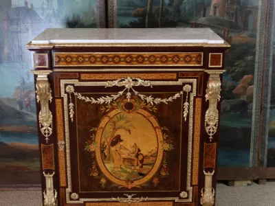 Aparador de época Napoleón III en marquetería con decoración estilo chino en la puerta. Rica decoración en bronce dorado. Muy alta calidad. Contáctenos para entrega.
