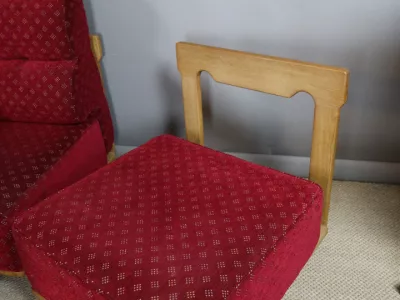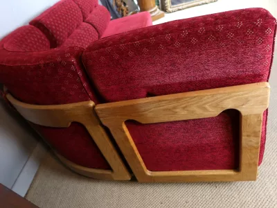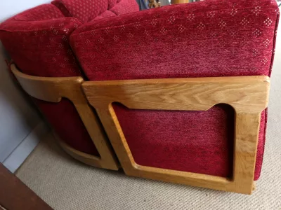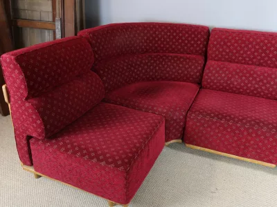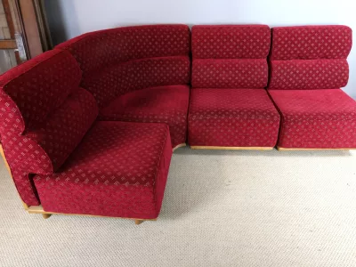 Cuatro sillones modulares de roble y tela roja original, de Guillerme y Chambron para "Votre Maison", modelo "Cleopatra". Tres asientos son rectos y uno es esquinero. Altura total: 103 cm. Altura del asiento: 35 cm. Buen estado original. Contáctenos para la entrega.