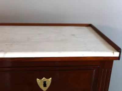 Escritorio cilíndrico de caoba estilo Luis XVI del siglo XIX con tablero de mármol. Interior equipado con su superficie de escritura original de cuero verde. Restaurado y repulido a la francesa. Contáctenos para su entrega.