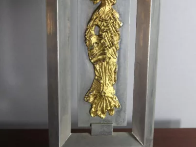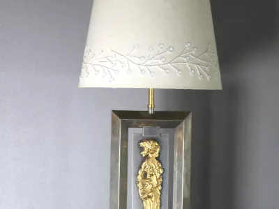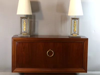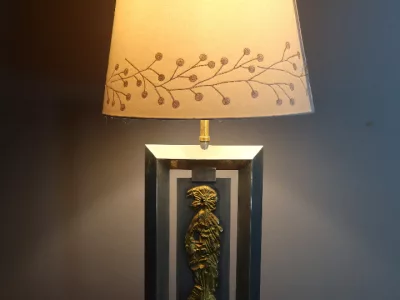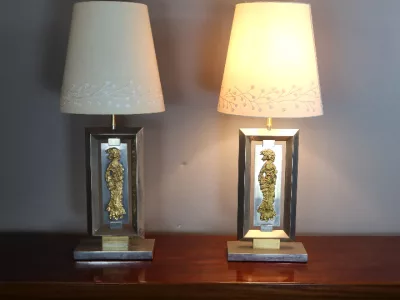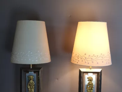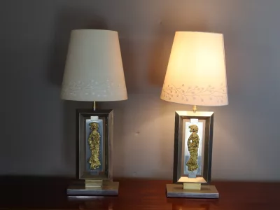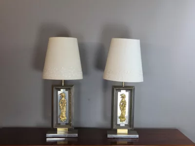 Pareja de lámparas cromadas firmadas por Bagues. Altura con pantallas: 82 cm. Altura sin pantallas: 53 cm. Contáctenos para la entrega.