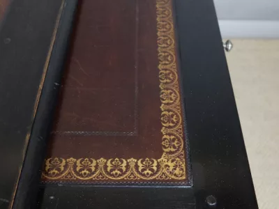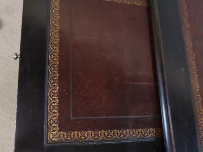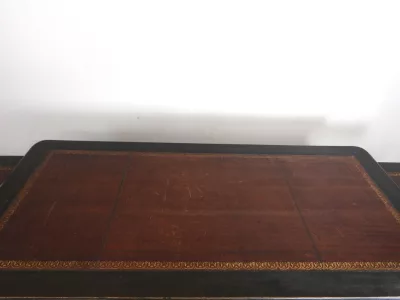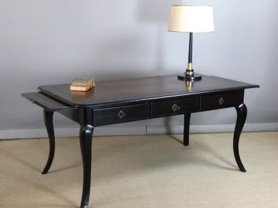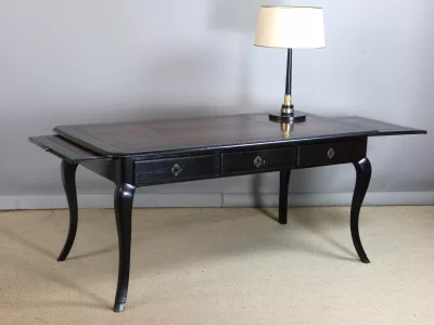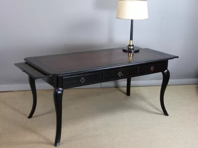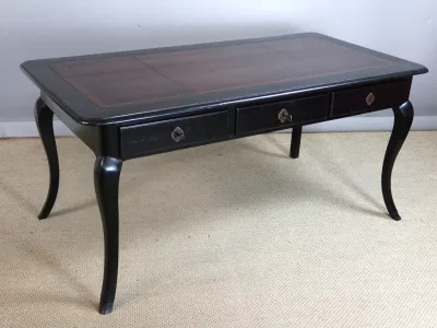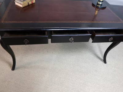 Escritorio estilo Luis XV en roble pintado, con tres cajones en un lateral y tres cajones simulados en el lateral de visitas. Tapa de cuero y hojas abatibles. Contáctenos para el envío.