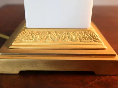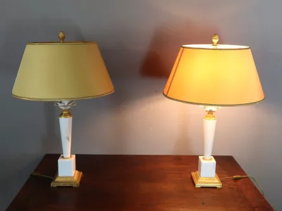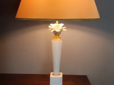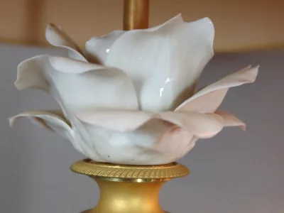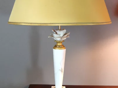 Par de lámparas de mármol, bronce dorado y flores de porcelana. Buen estado, solo faltan dos pequeñas piezas de las flores de capodimonte. Altura total con pantalla: 82 cm (altura de las pantallas: 27 cm). Contáctenos para información sobre el envío.